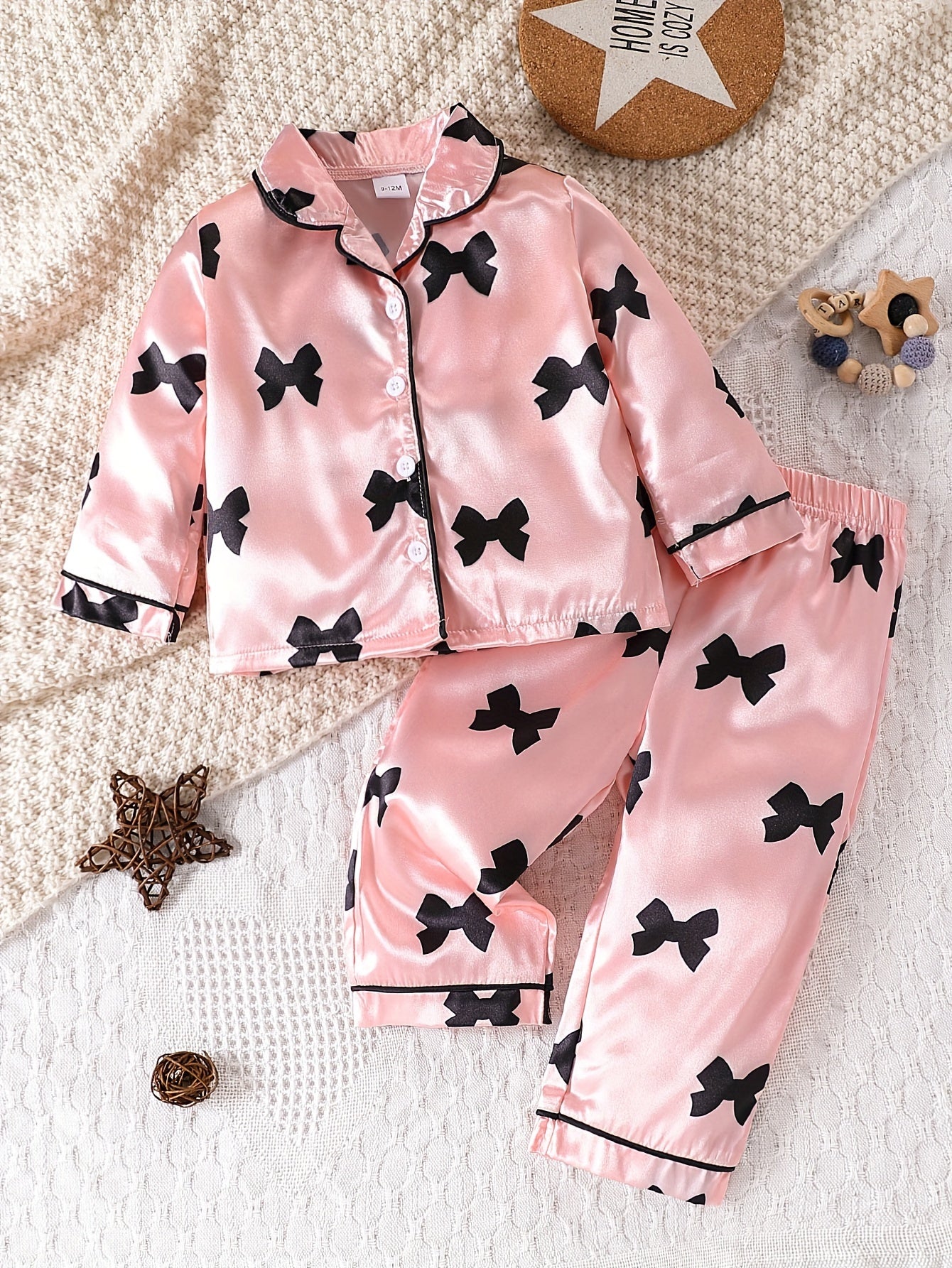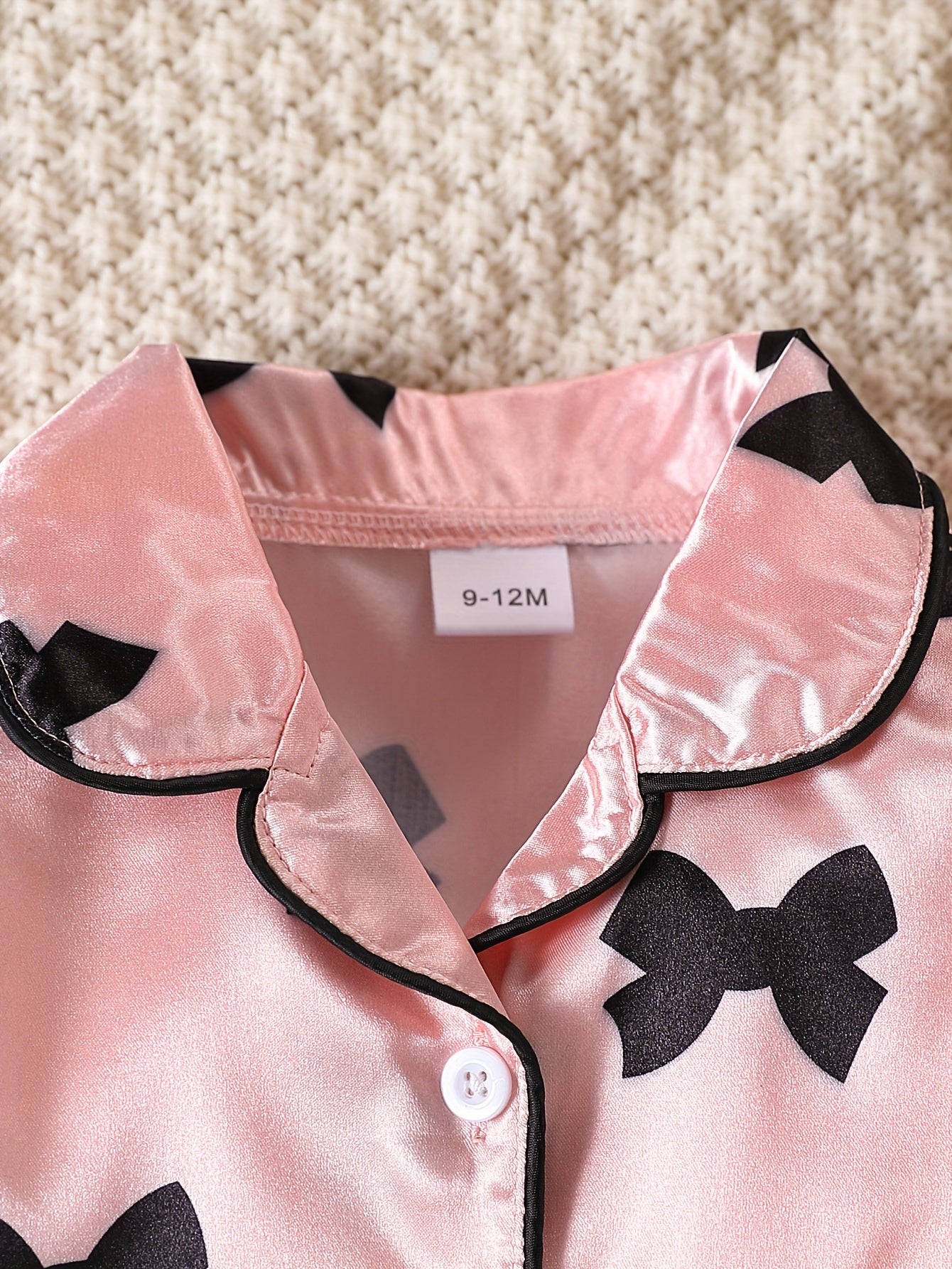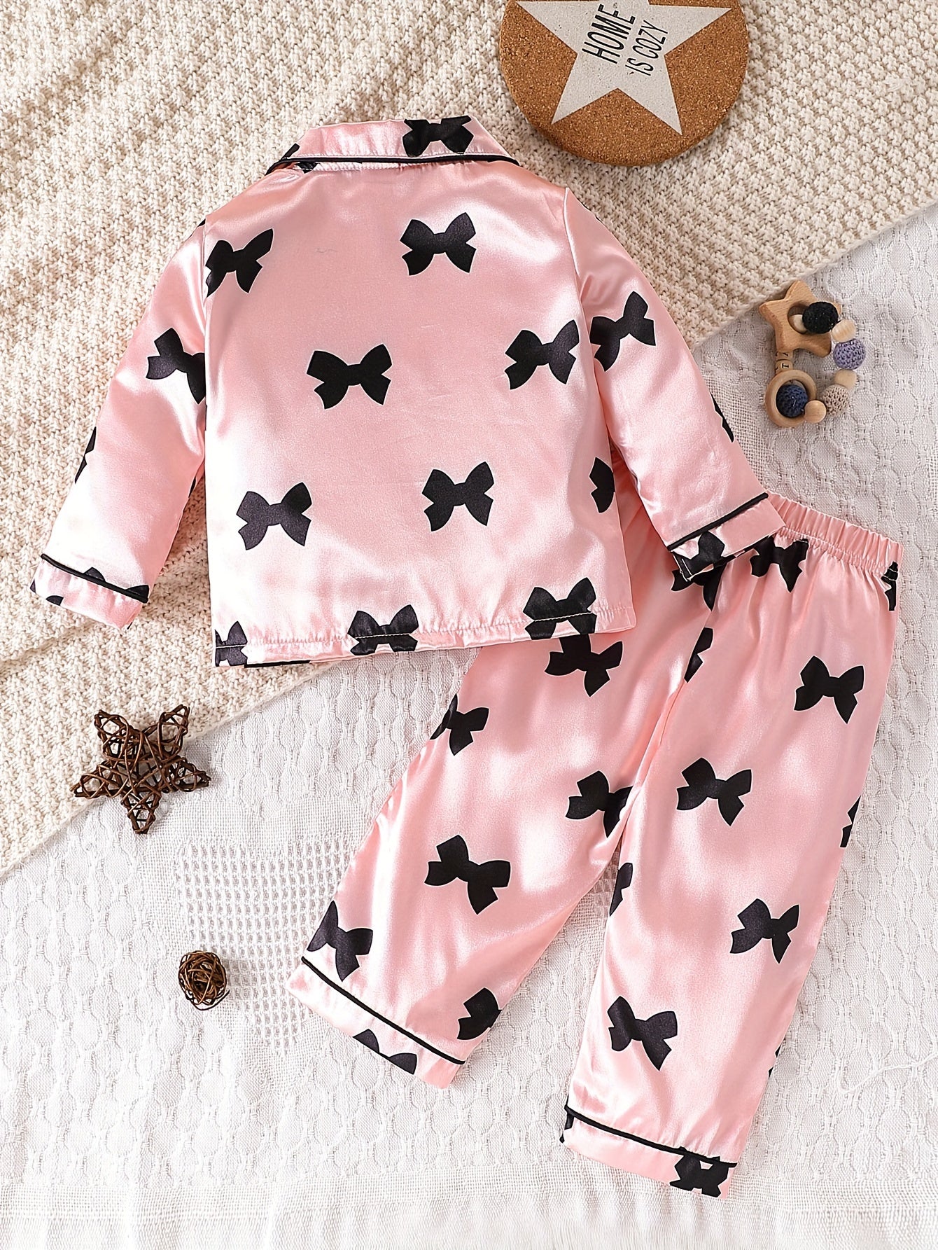Baby Girl's Elegant Pajama Set, Cute Bow Print Lapel Long Sleeve Shirts & Trousers