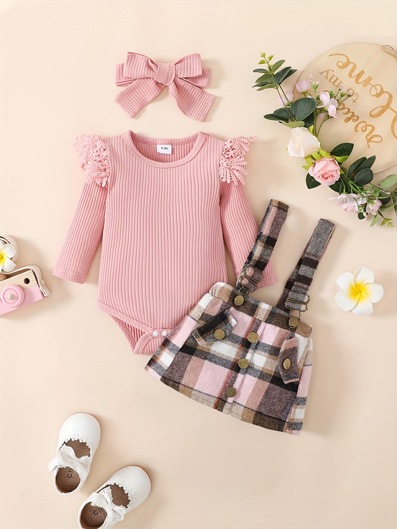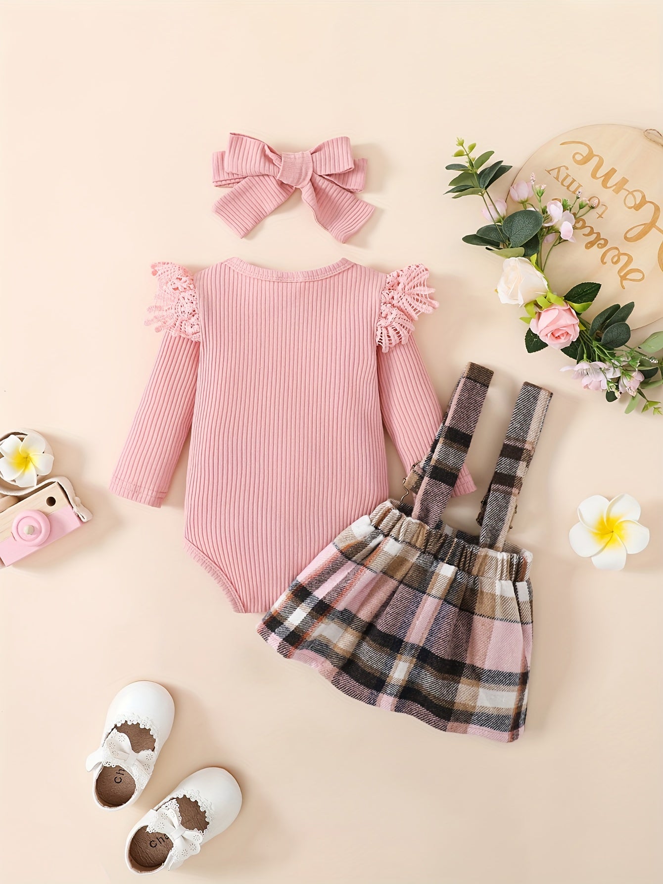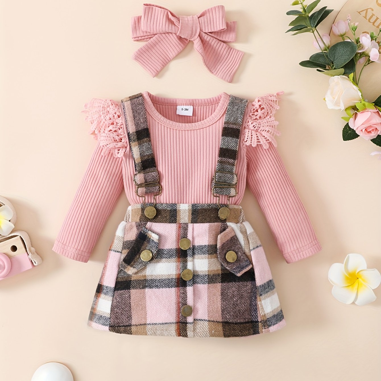 Cozy Cotton Blend Long Sleeve Romper, Plaid Skirt with Adjustable Straps & Matching Headband