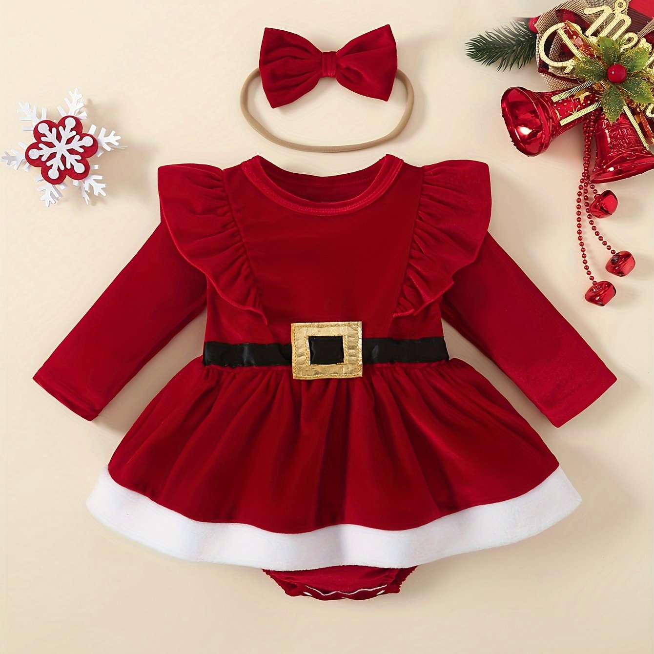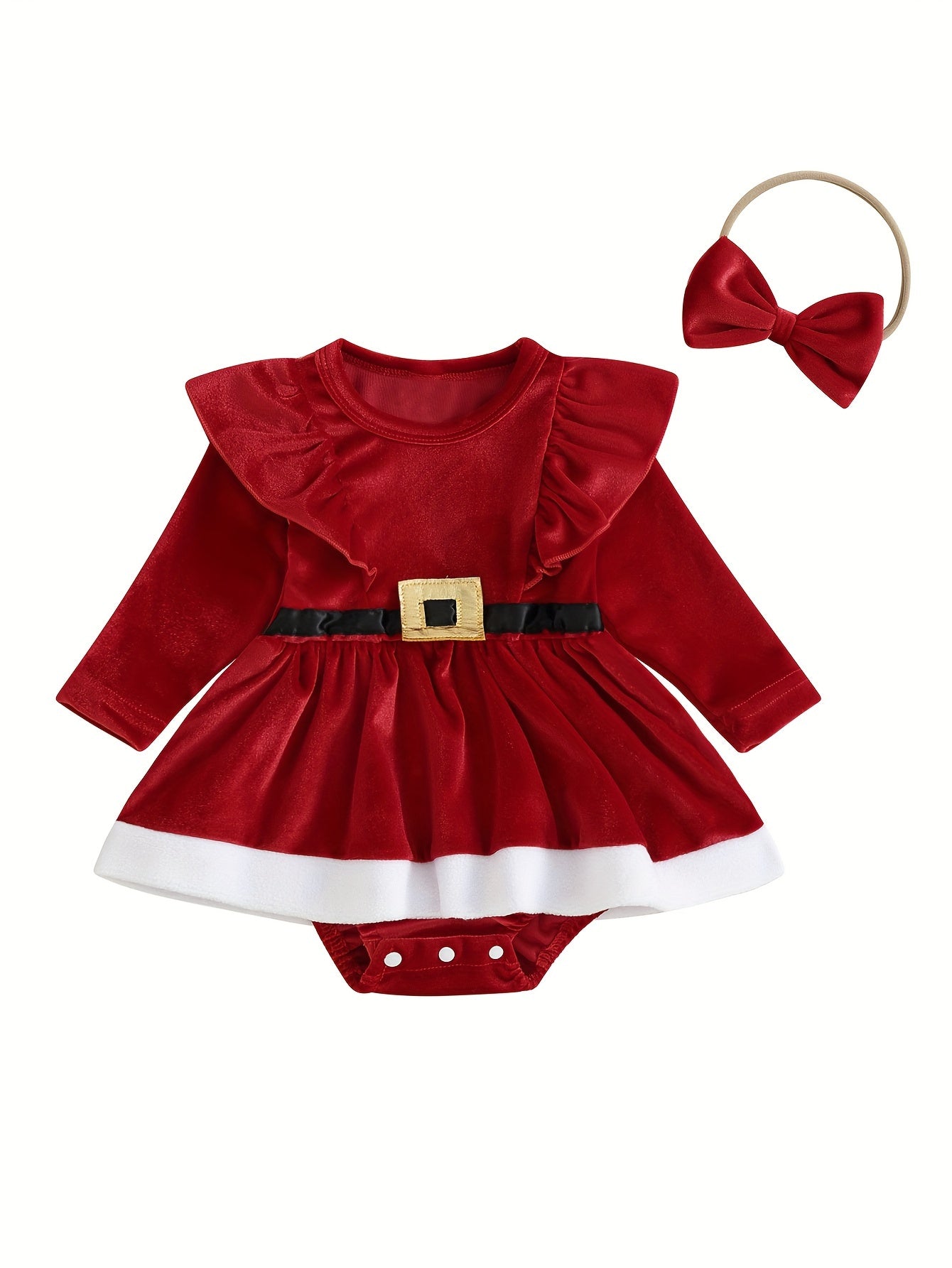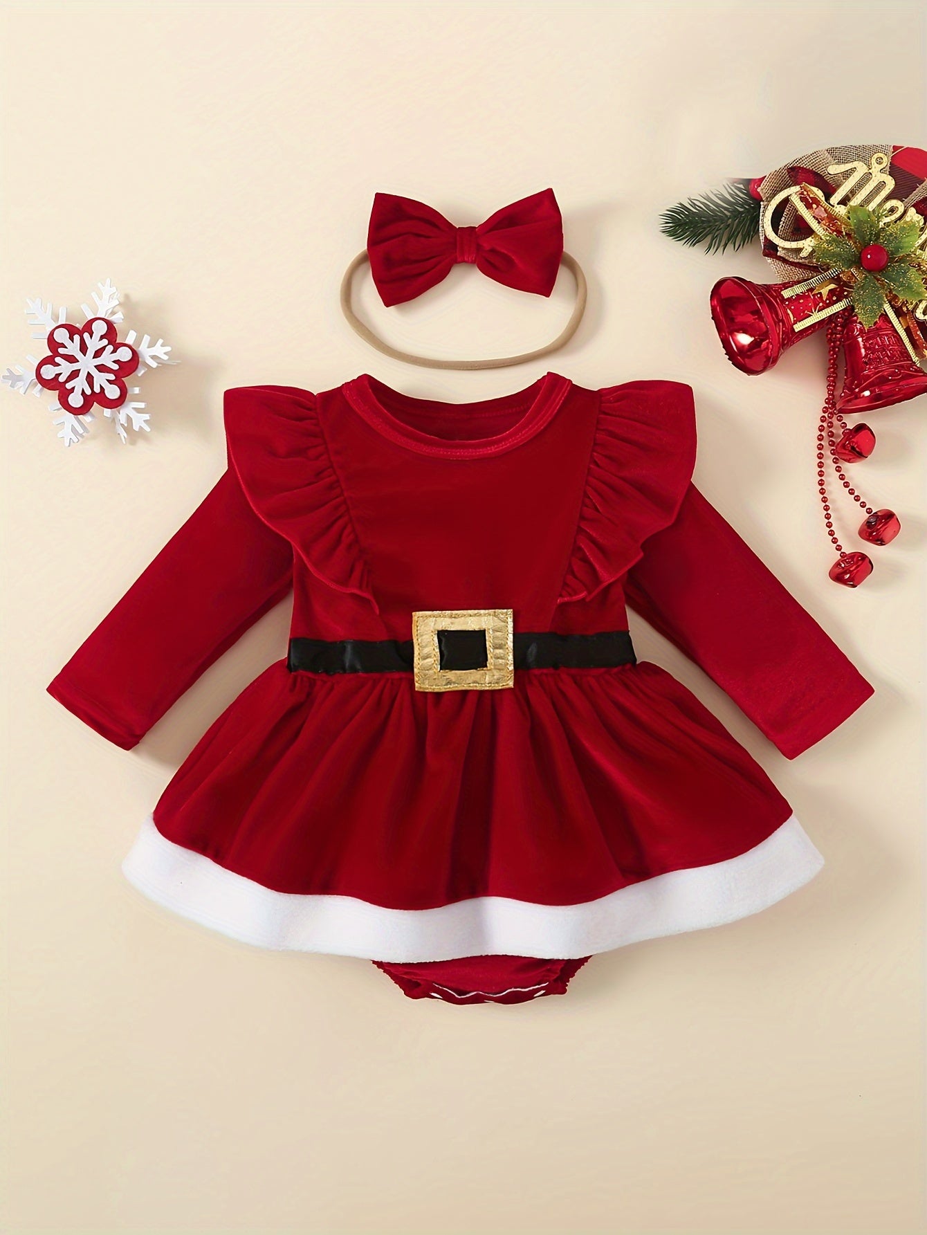 Baby Girl's Long Sleeves Jumpsuit With Skirt's Hemline & Bowknot Headscarf Set