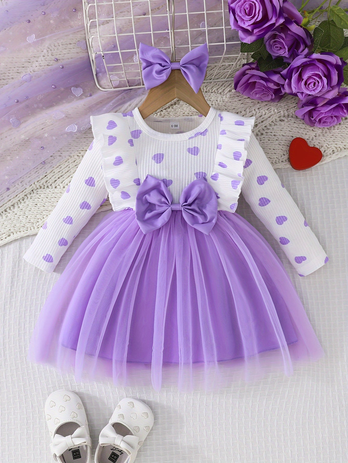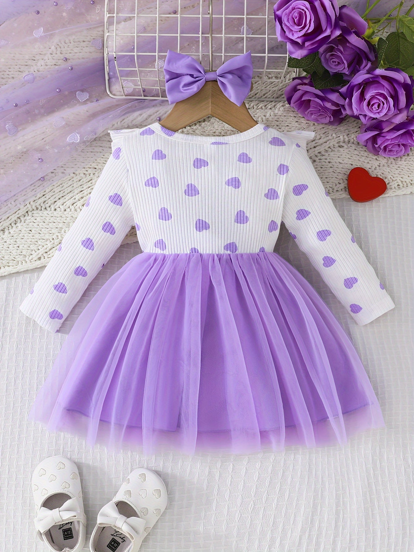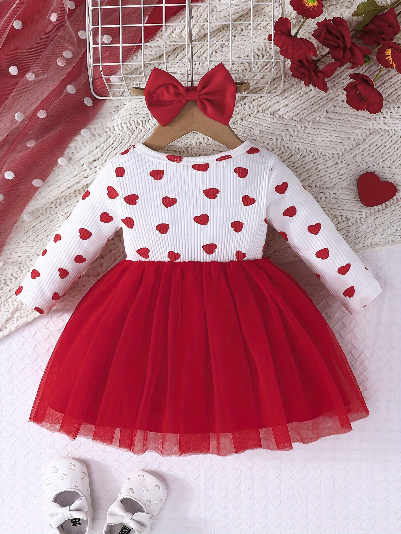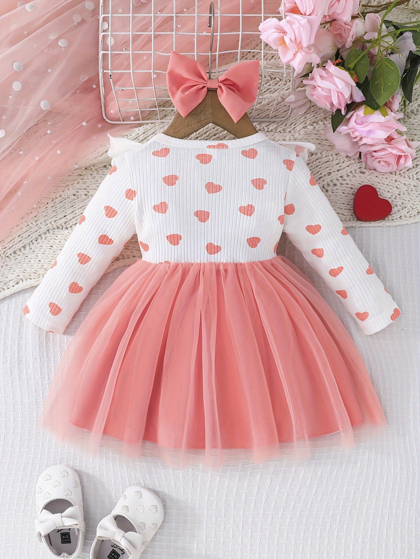 Girls' Cute Heart Pattern Long Sleeve Tulle Dress with Bow Headband