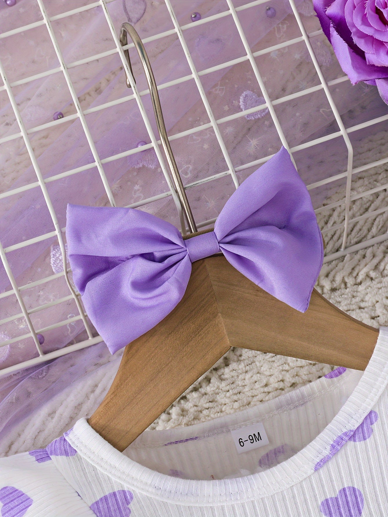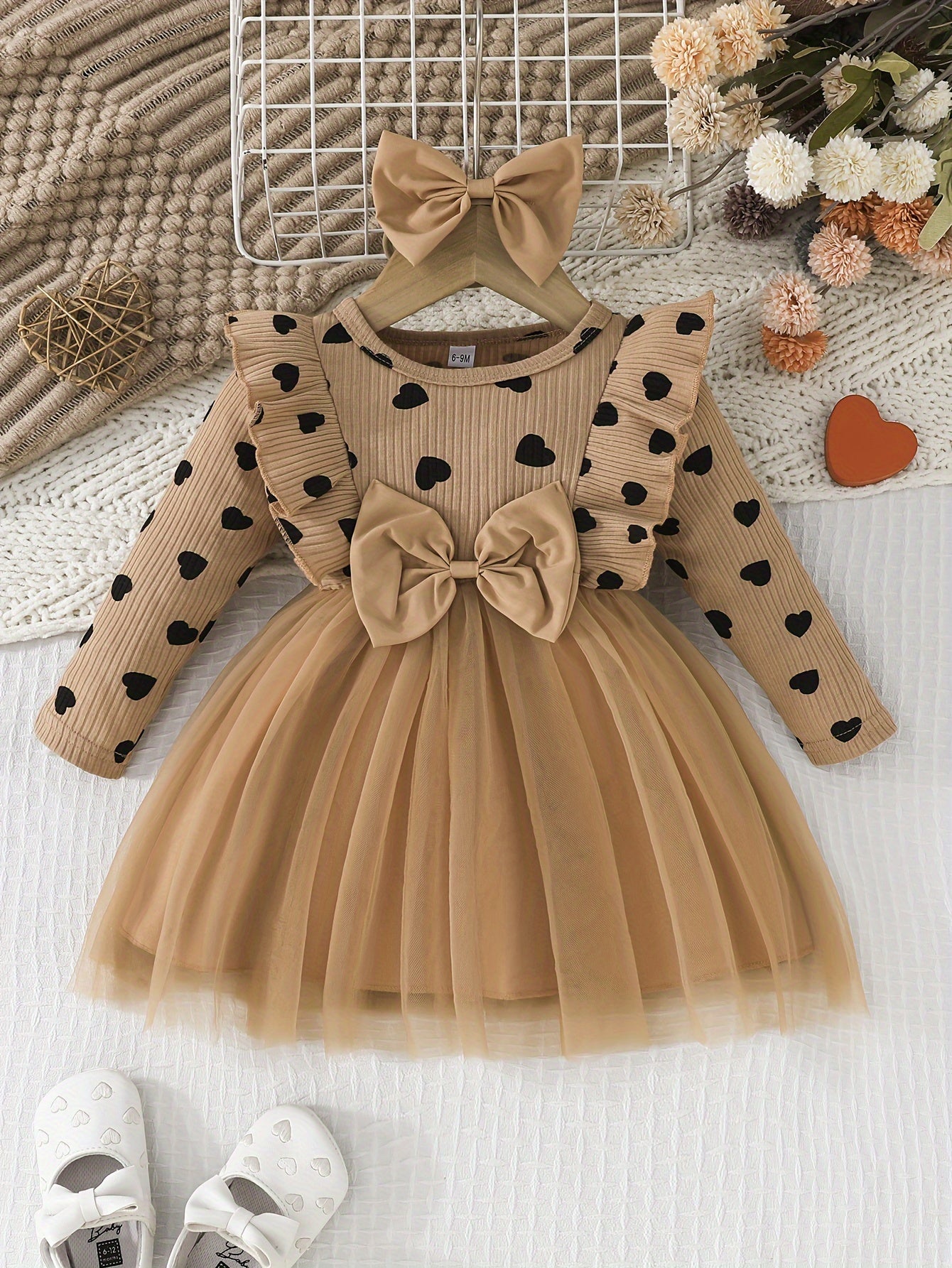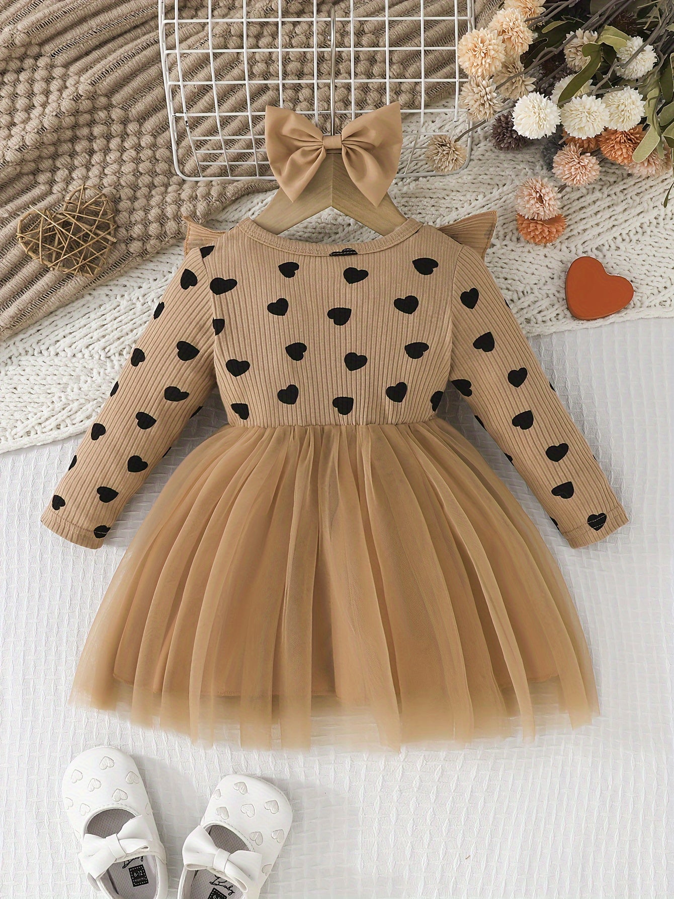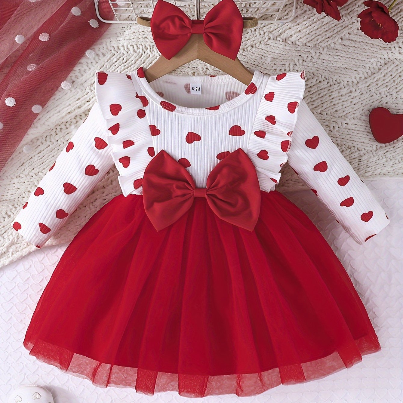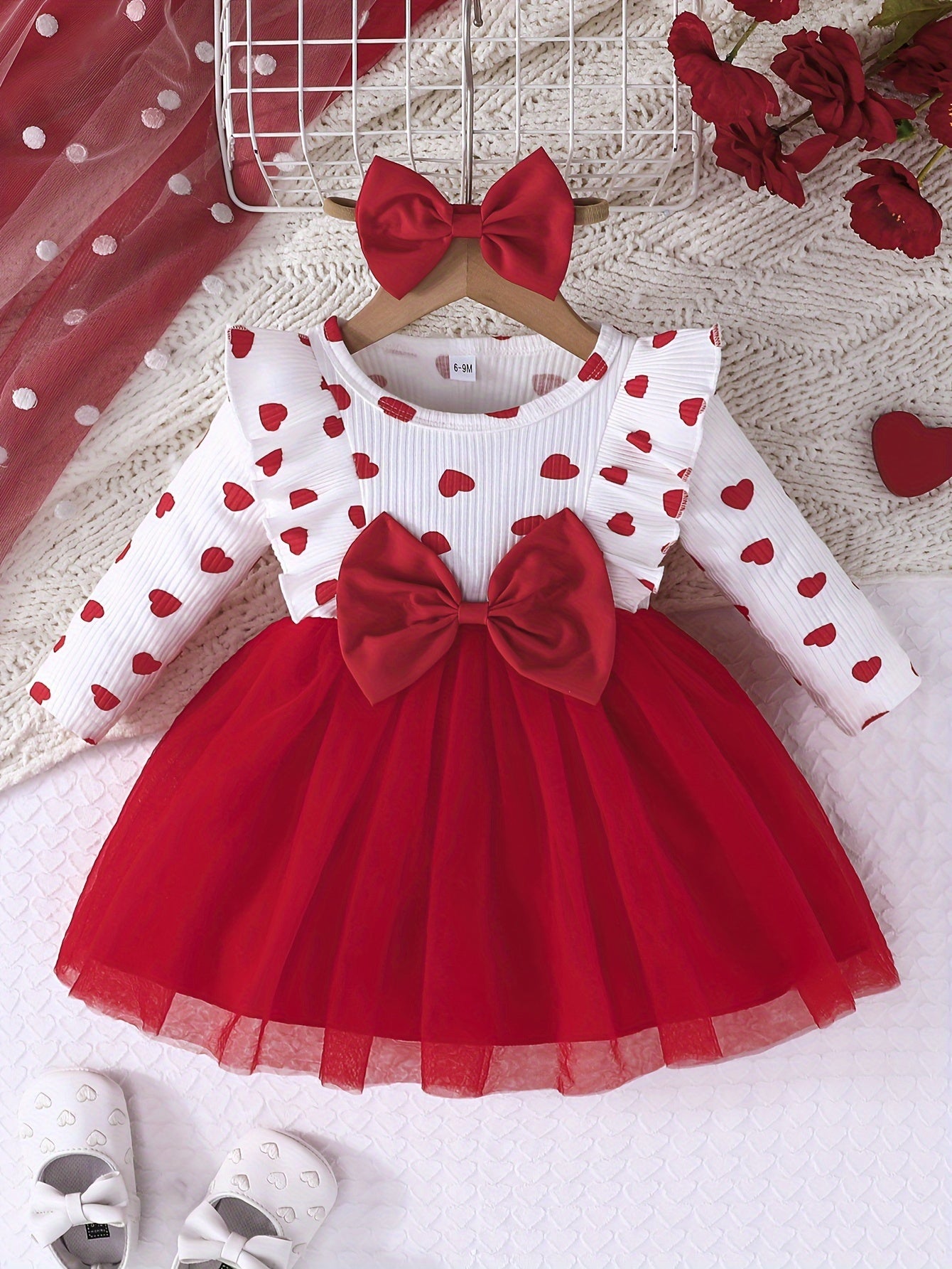 Girls' Cute Heart Pattern Long Sleeve Tulle Dress with Bow Headband