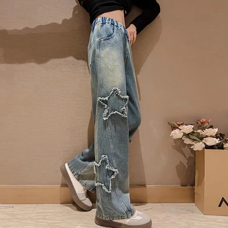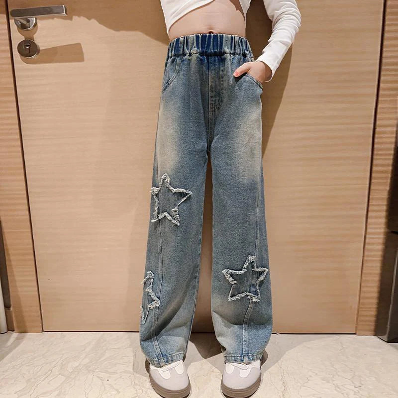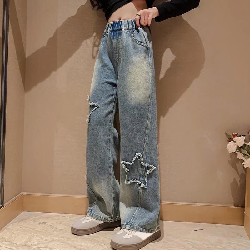IENENS High Waist Jeans Girl Straight Loose Wide-leg Pants Spring and Autumn Korean Baggy Jeans Fashion Kids Denim Trousers